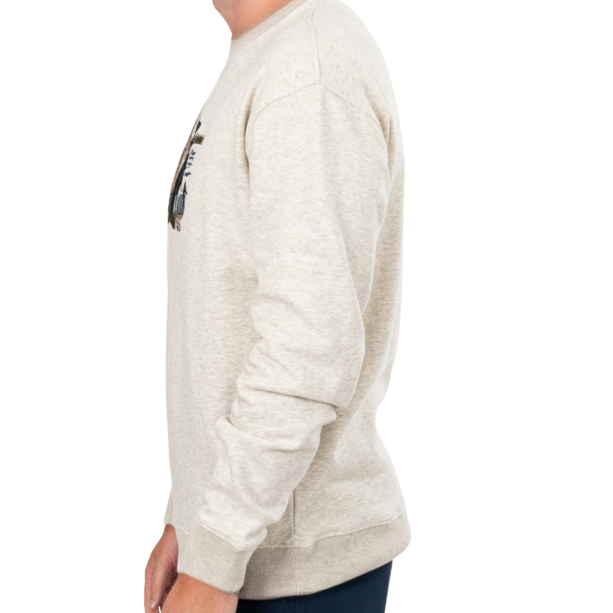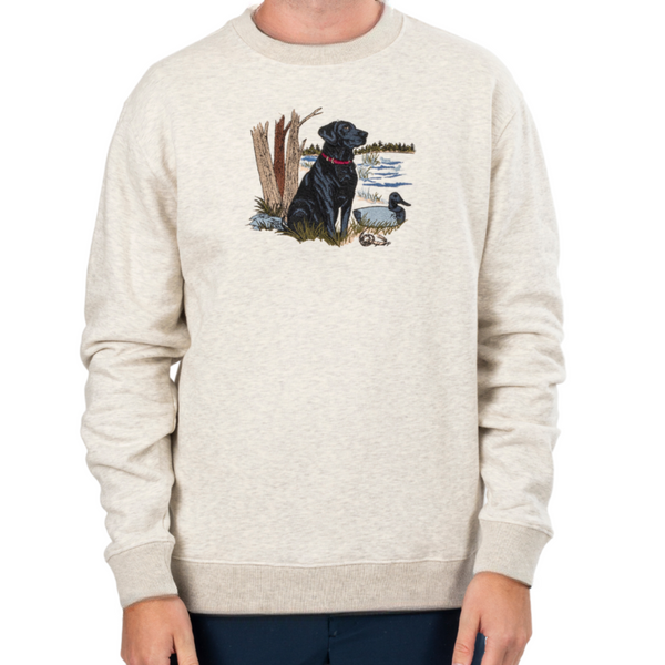 Great for any outdoorsman, this 60% 40% Cotton Poly crew neck sweatshirt has full chest embroidery with man's best friend and a duck decoy in a picturesque setting. The perfect gift for any hunter or lover of nature.